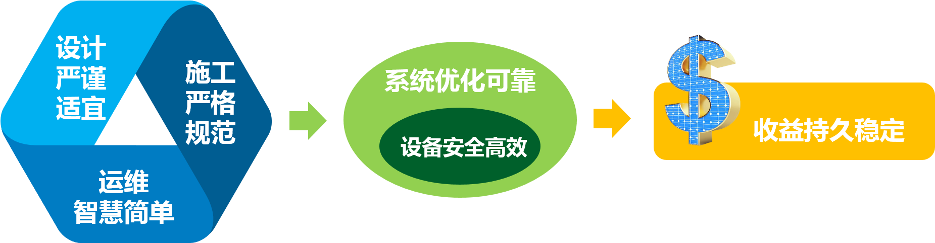 我們通過嚴謹適宜的設計、嚴格規范的施工和智慧簡單的運維,建設并運營一個由安全高效的設備組成的優化可靠的新能源發電系統,使業主收獲持久穩定的收益。